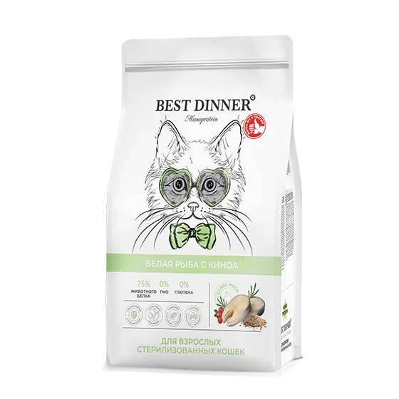 Best Dinner Монопротеин Белая рыба с Киноа разработан специально для стерилизованных и кастрированных кошек, страдающих от аллергии и проблем с пищеварением. Основу рациона составляет белая рыба - этот легкоусвояемый источник белка идеально подходит для кошек с чувствительным пищеварением. Белая рыба богата Омега-3 жирными кислотами, необходимыми для здоровья кожи и шерсти.
