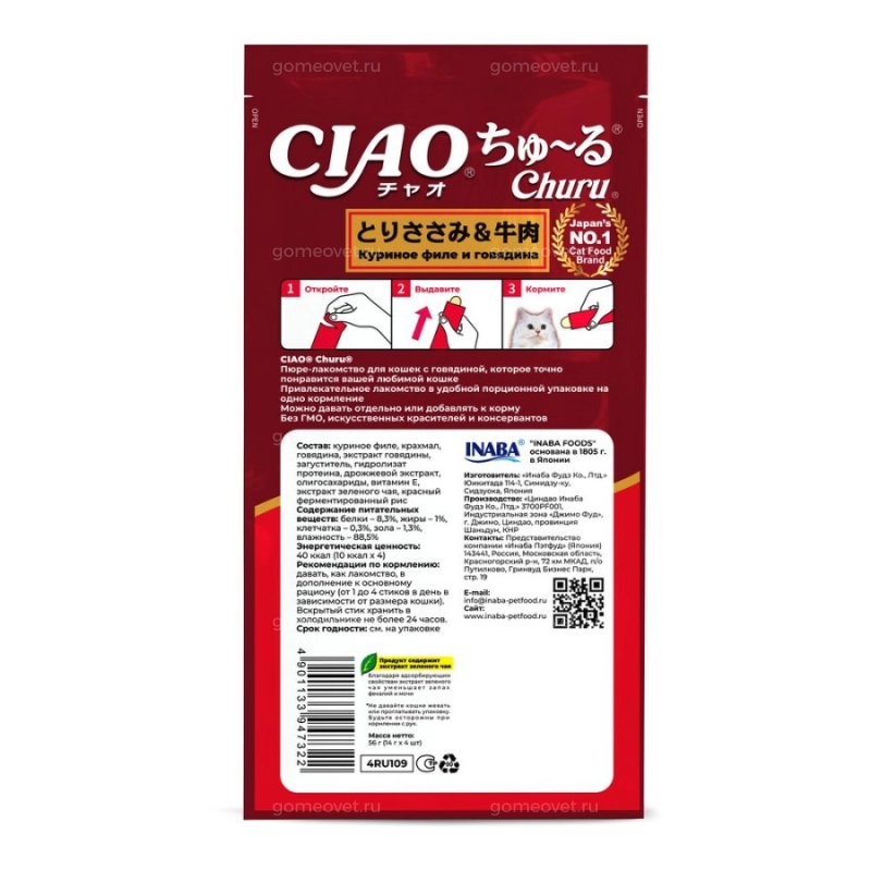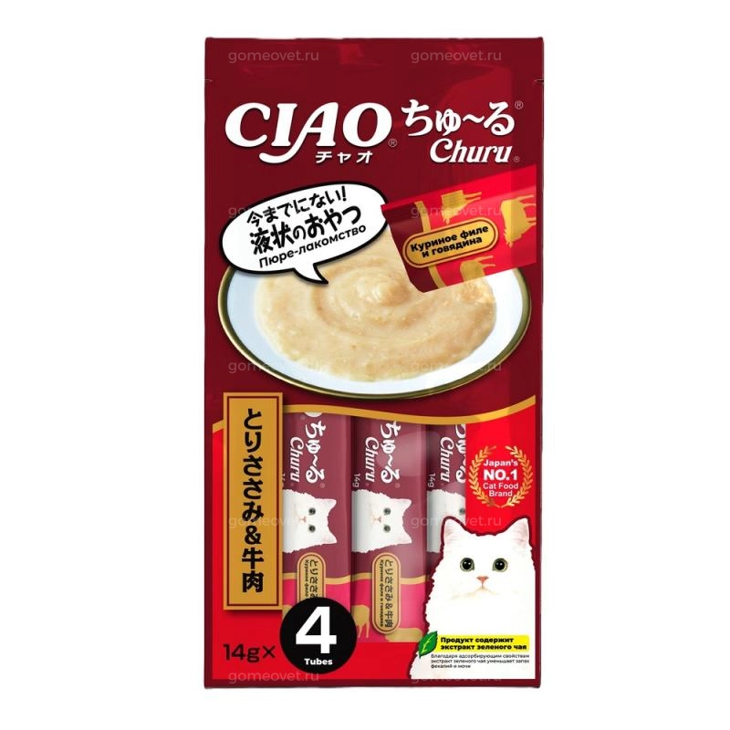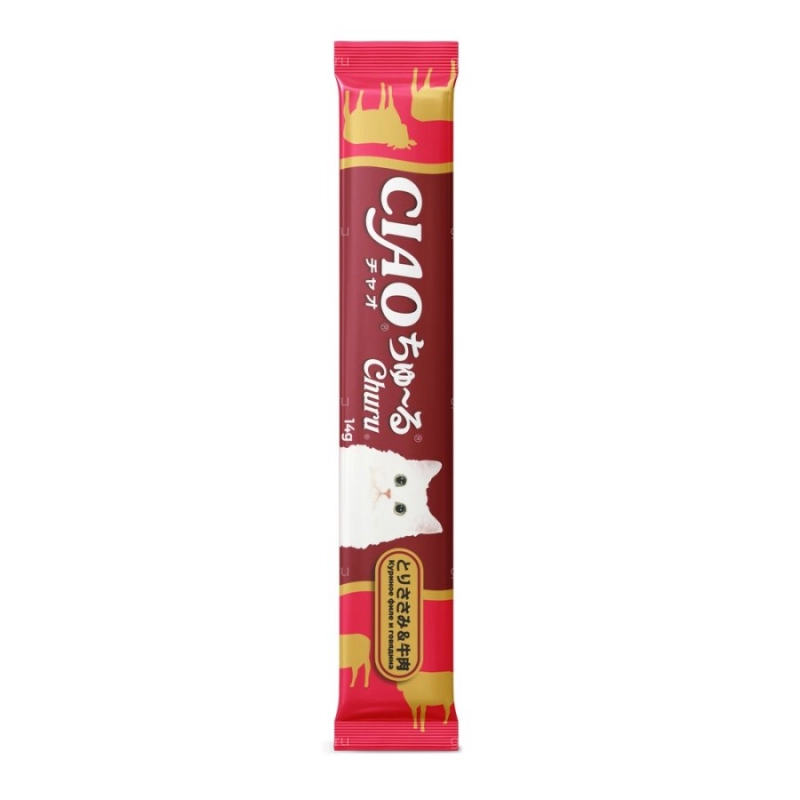 Суперпремиальное лакомство-пюре CIAO Churu (ЧАО ЧУРУ) на основе нежного филе фермерской курицы с добавлением говядины от японского производителя Inaba изготовлено исключительно из натуральных ингредиентов и отличается высоким процентом влажности, благодаря чему поддерживается водный баланс организма кошки. Корма и лакомства Inaba отличаются высоким качеством и неповторимым вкусом, ведь они изготавливаются только из отборных традиционных японских ингредиентов! Удобная упаковка позволяет кормить питомца прямо с рук, используя лакомство для поощрения или дрессировки или использовать его как топпинг к сухому или влажному корму. Во все продукты добавлен экстракт зеленого чая, который, благодаря содержанию катехина, обладает нейтрализующим действием на запах содержимого кишечника. Пюре-лакомство обогащено витамином Е - натуральным антиоксидантом, поддерживающим иммунную систему, не содержит искусственных добавок, красителей и консервантов.