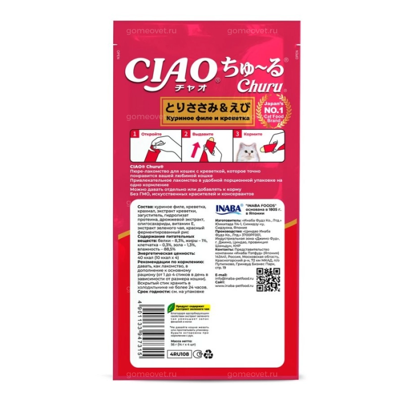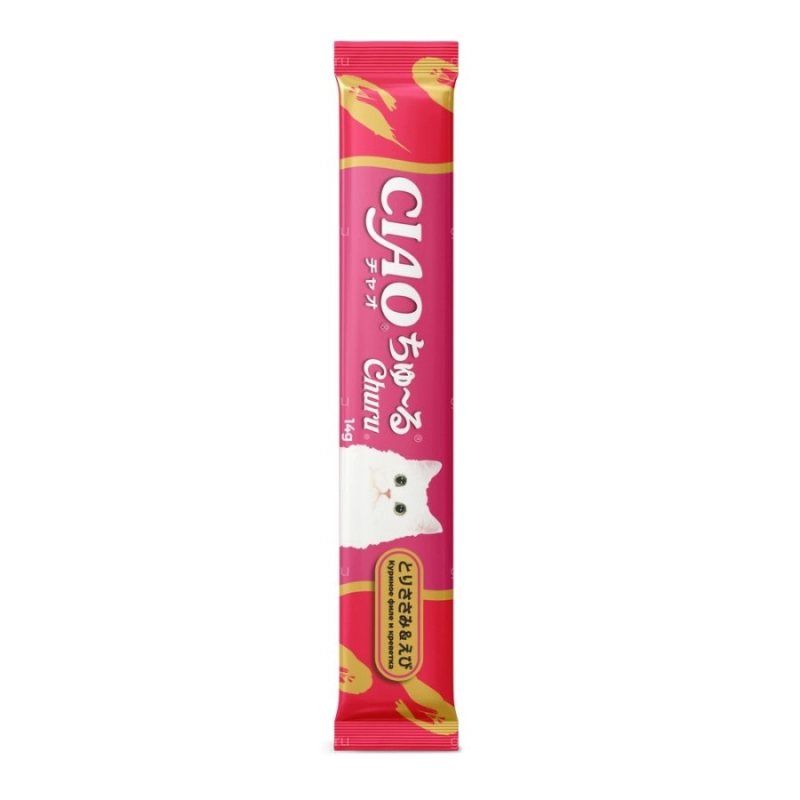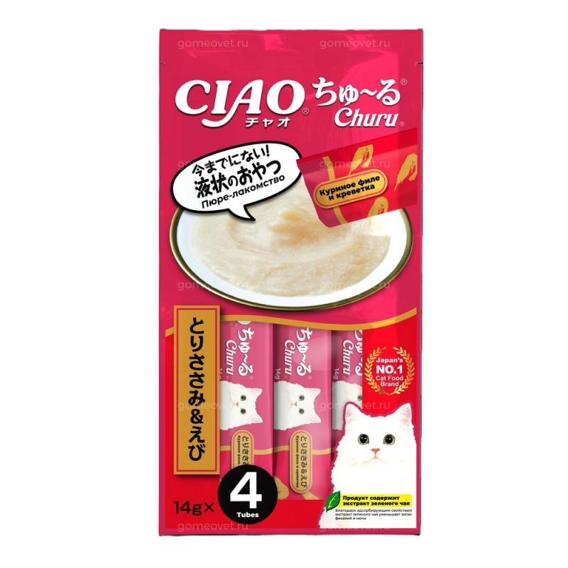 Суперпремиальное пюре-лакомство CIAO Churu (ЧАО ЧУРУ) на основе нежного филе фермерской курицы с добавлением креветок от японского производителя Inaba изготовлено исключительно из натуральных ингредиентов и отличается высоким процентом влажности, благодаря чему поддерживается водный баланс организма кошки. Корма и лакомства Inaba отличаются высоким качеством и неповторимым вкусом, ведь они изготавливаются только из отборных традиционных японских ингредиентов! Удобная упаковка позволяет кормить питомца прямо с рук, используя лакомство для поощрения или дрессировки или использовать его как топпинг к сухому или влажному корму. Во все продукты добавлен экстракт зеленого чая, который, благодаря содержанию катехина, обладает нейтрализующим действием на запах содержимого кишечника. Пюре-лакомство обогащено витамином Е - натуральным антиоксидантом, поддерживающим иммунную систему, не содержит искусственных добавок, красителей и консервантов.